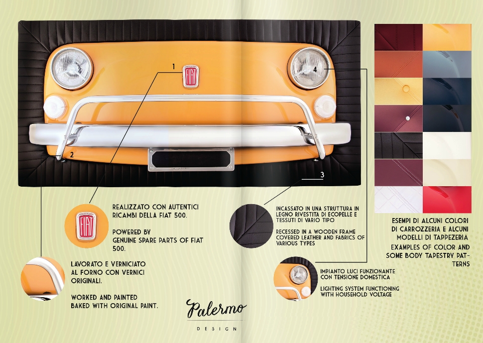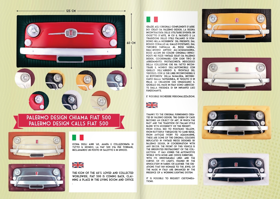 Il modello della Fiat 500, concepita da Palermo Design, diventa oggetto d’arredo per interni, simbolo ed evocazione del gusto e del “bello” italiano.